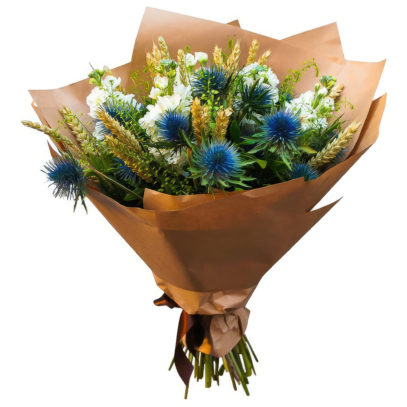 Эрингиум, колосья пшеницы, маттиола белая, зелень. Упаковка (лента, пленка, крафт, сетка, пленка матовая)