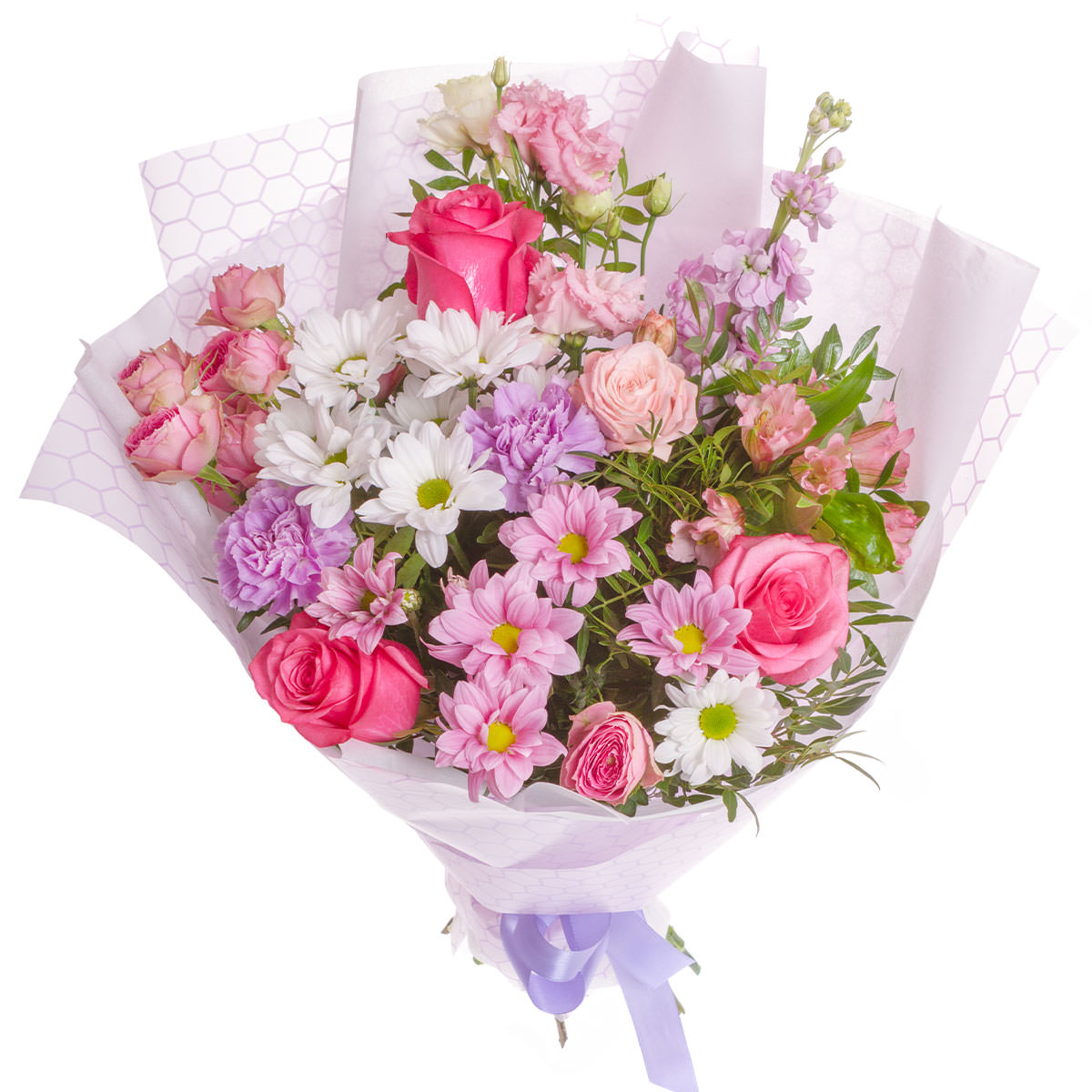 Хризантема кустовая розовая и белая, гвоздика сиреневая, роза одноголовая розовая, роза кустовая розовая, альстромерия розовая, эустома розовая, маттиола сиреневая, розовая. Упаковка (лента, пленка, крафт, сетка, пленка матовая)
