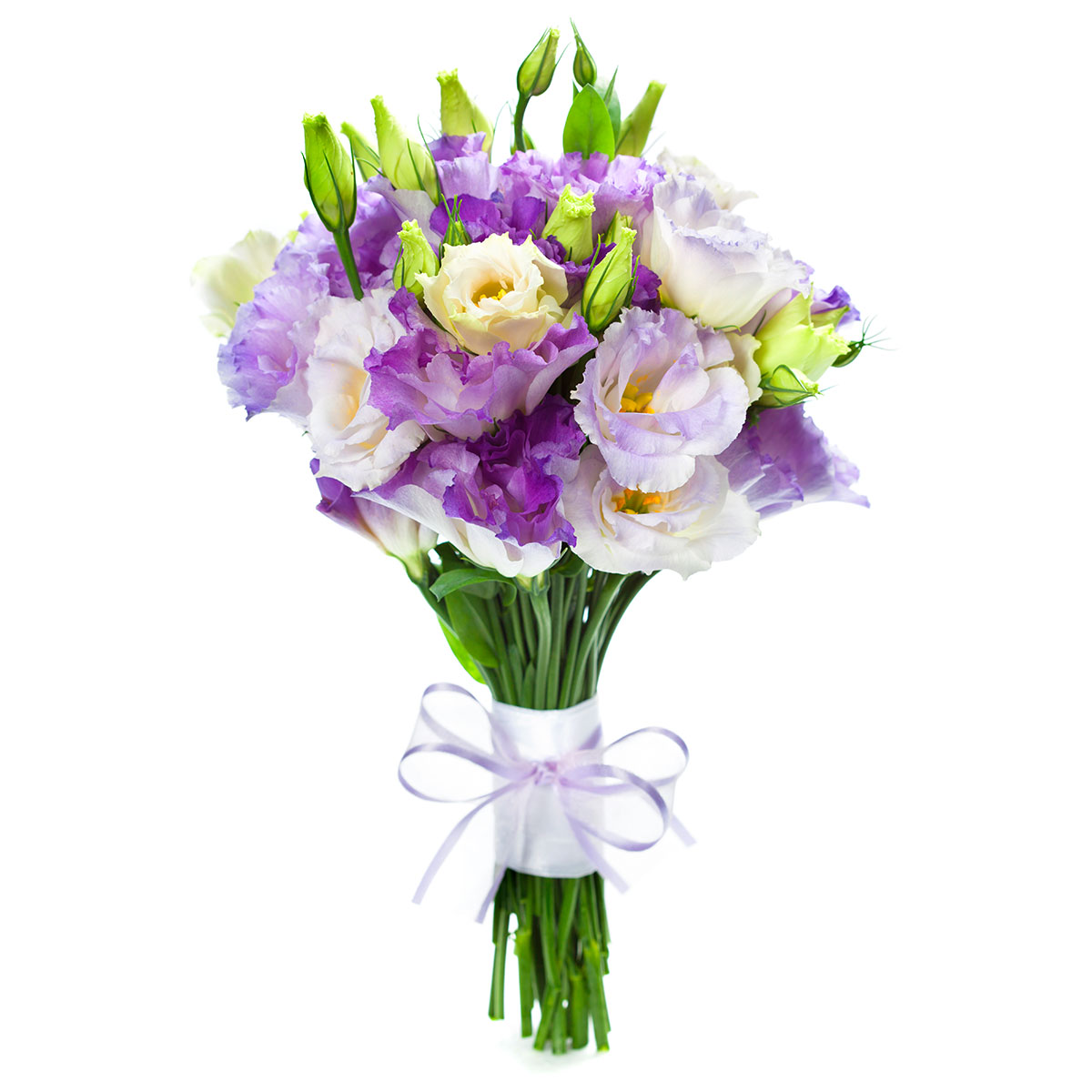 Эустома белая и фиолетовая. Упаковка (лента, пленка, крафт, сетка, пленка матовая)