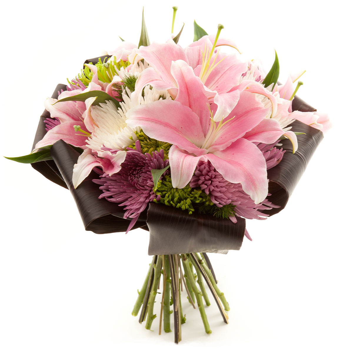 Лилия розовая, хризантема розовая и белая, аспидистра. Упаковка (лента, пленка, крафт, сетка, пленка матовая)