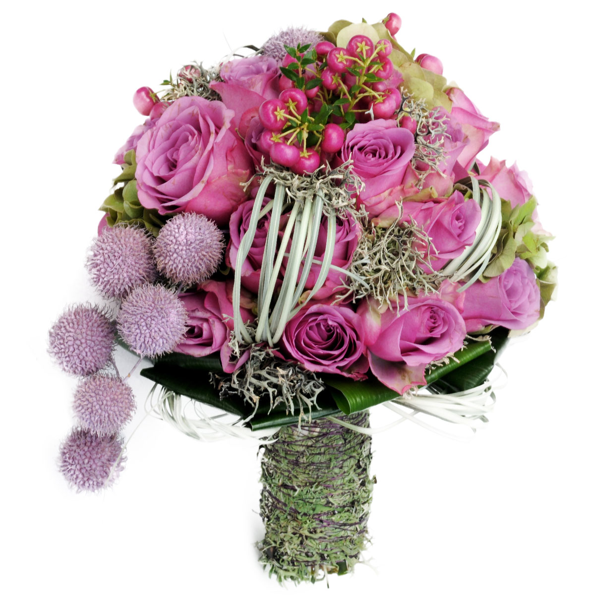 Роза одноголовая сиреневая, парнеттия, гортензия зеленая, чертополох, экзотическая зелень. Упаковка (лента, пленка, крафт, сетка, пленка матовая)
