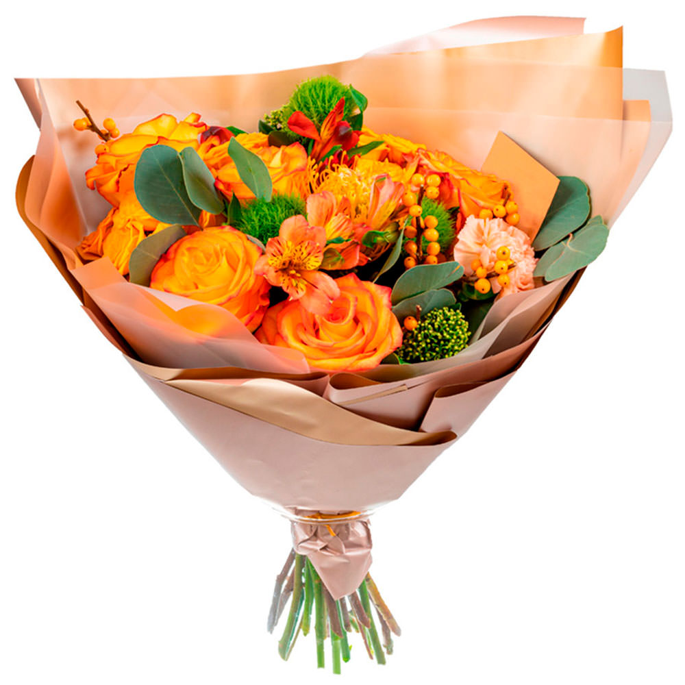 Роза одноголовая оранжевая, альстромерия оранжевая, гвоздика кремовая, гиперикум, эвкалипт, зелень. Упаковка (лента, пленка, крафт, сетка, пленка матовая)