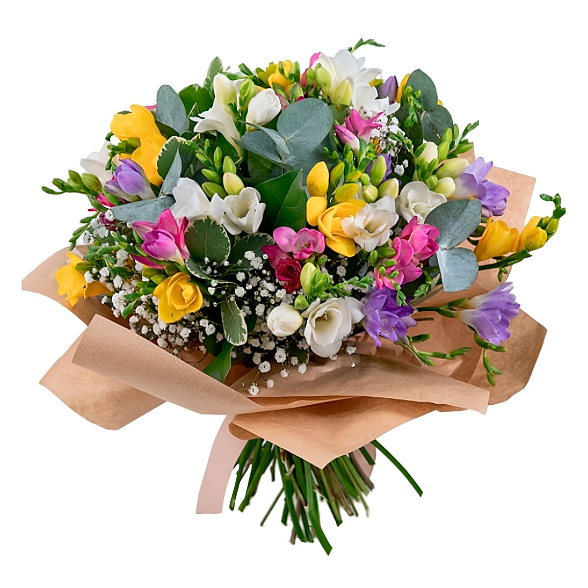 Фрезия разных цветов, гипсофила, эвкалипт, зелень. Упаковка (лента, пленка, крафт, сетка, пленка матовая)