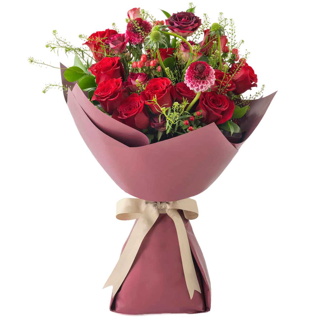 Роза одноголовая красная, роза кустовая темно-розовая кенийская, скабиоза, гиперикум, зелень. Упаковка (лента, пленка, крафт, сетка, пленка матовая)