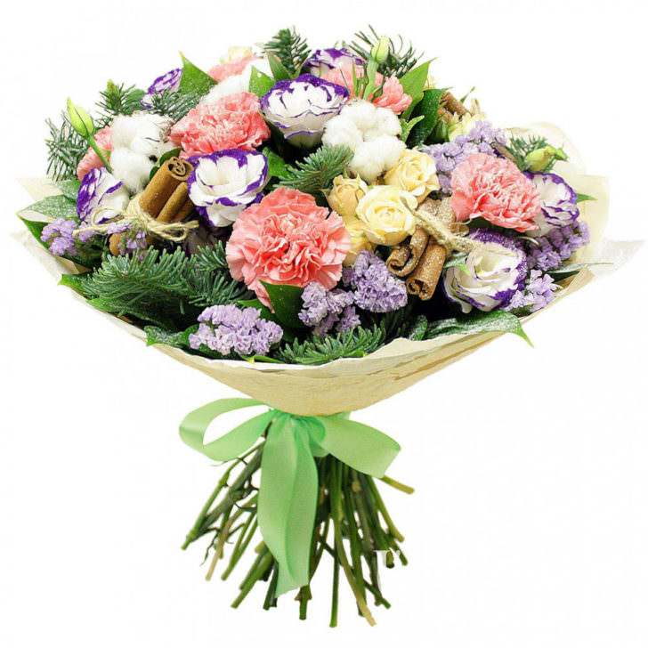 Эустома бело-фиолетовая, гвоздика розовая, роза кустовая кремовая, хлопок, статица, декоративные элементы, хвоя, зелень. Упаковка (лента, пленка, крафт, сетка, пленка матовая)
