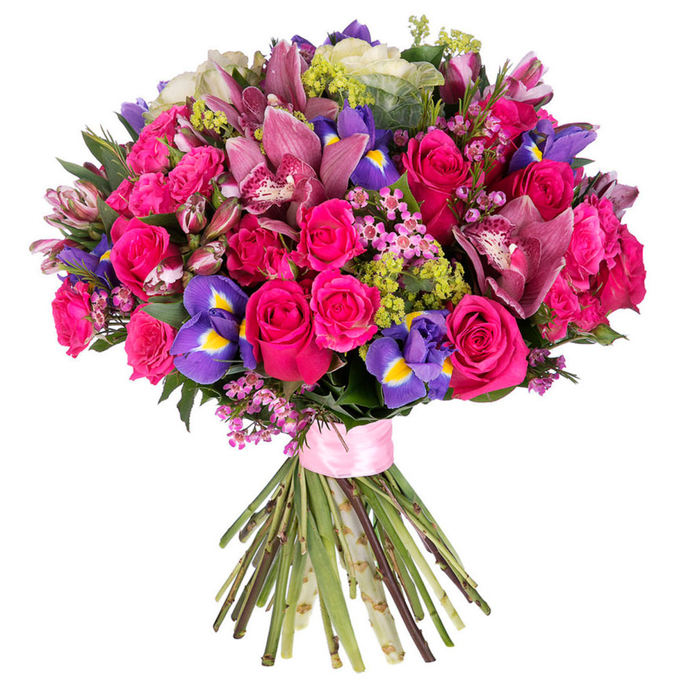 Роза одноголовая розовая, ирис, альстромерия розовая, орхидея розовая, статица, роза кустовая розовая, ваксфлауэр, брассика. Упаковка (лента, пленка, крафт, сетка, пленка матовая)