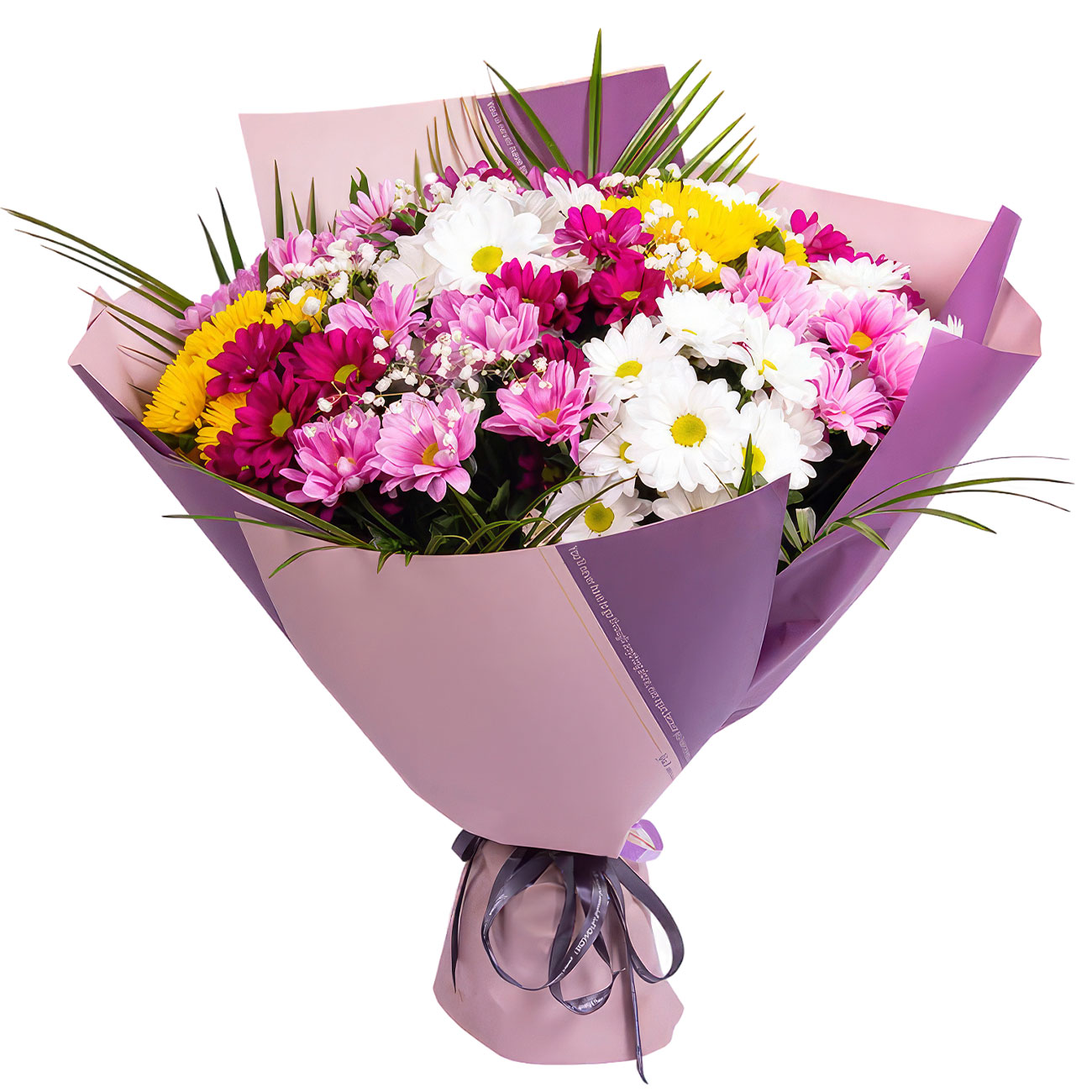 Хризантема кустовая белая, сиреневая, розовая и желтая, гипсофила. Упаковка (лента, пленка, крафт, сетка, пленка матовая)