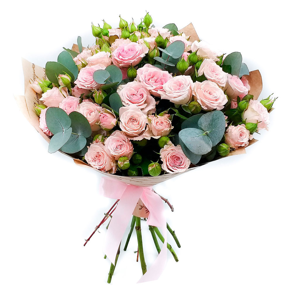 Роза кустовая нежно-розовая, эвкалипт. Упаковка (лента, пленка, крафт, сетка, пленка матовая)