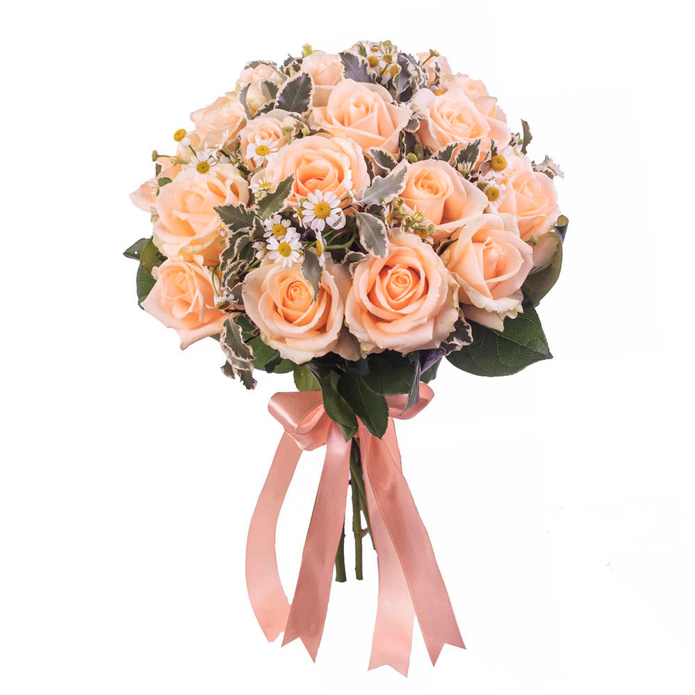 Роза одноголовая персиковая, ромашка кустовая, зелень. Упаковка (лента, пленка, крафт, сетка, пленка матовая)