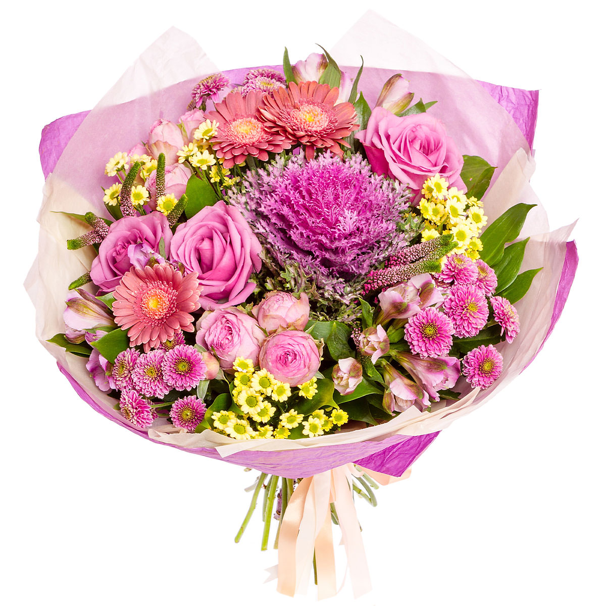 Роза одноголовая розовая, роза кустовая пионовидная розовая, брассика розовая, альстромерия розовая, хризантема сантини, хризантема розовая, гербера розовая. Упаковка (лента, пленка, крафт, сетка, пленка матовая)