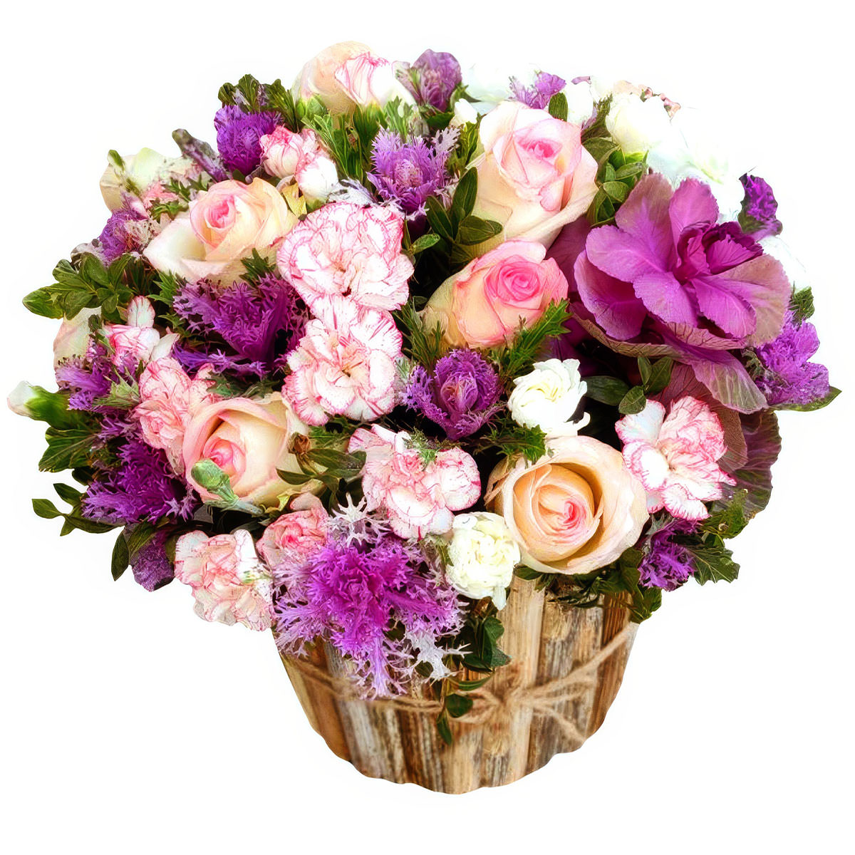 Роза одноголовая розовая, капуста декоративная, гвоздика розовая, фисташка. Упаковка (Корзина, оазис, ящик).