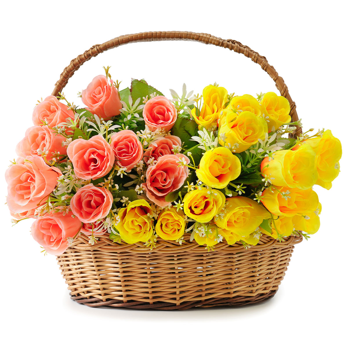 Роза одноголовая розовая и желтая, зелень. Упаковка (Корзина, оазис, ящик).