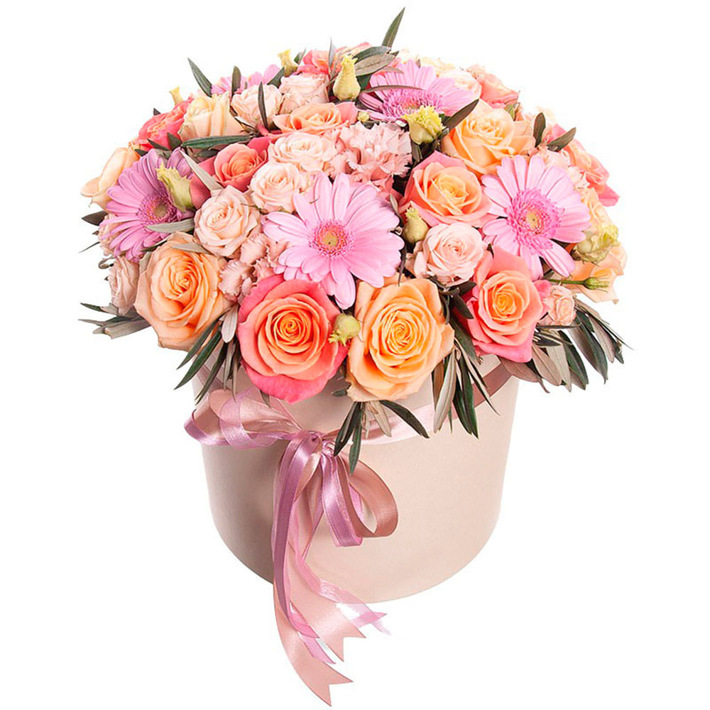 Гербера розовая, роза одноголовая персиковая, роза кустовая розовая, эустома кремовая, зелень. Упаковка (шляпная коробка, квадратный бокс, коробка сердце, оазис)