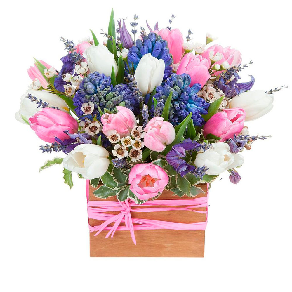 Гиацинт, тюльпан микс (белый, розовый), питтоспорум, ваксфлауэр, лимониум. Упаковка (шляпная коробка, квадратный бокс, коробка сердце, оазис)