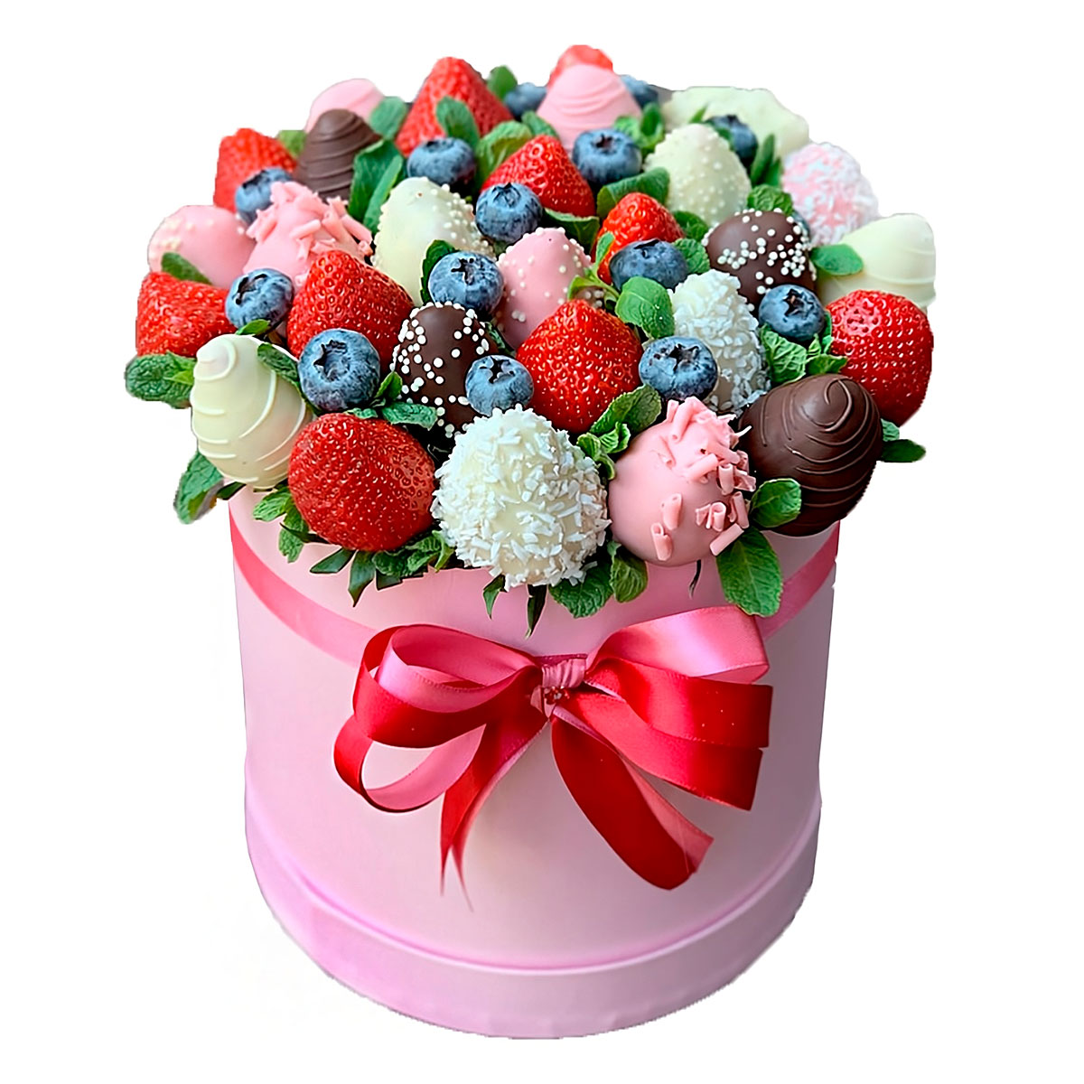Клубника в шоколаде, чернослив, цветочный декор. Упаковка (шляпная коробка, квадратный бокс, коробка сердце, оазис)