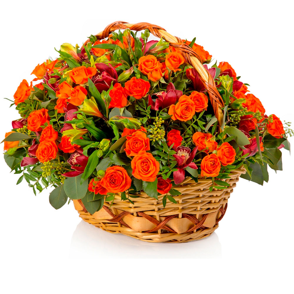 Роза кустовая оранжевая, альстромерия красная, орхидея красная, зелень. Упаковка (Корзина, оазис).