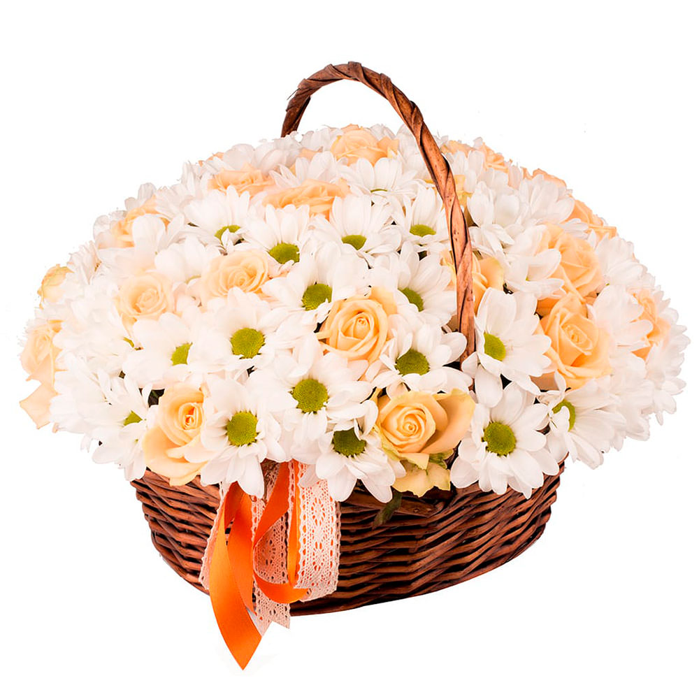 Хризантема кустовая белая, роза одноголовая кремовая. Упаковка (Корзина, оазис).